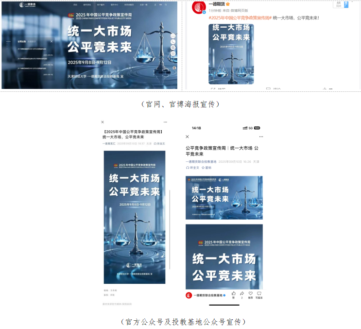 一德期货结合活动主题“统一大市场 公平竞未来”制作警示标语及海报在公司官方网站、官方微博、官方公众号、投教基地公众号进行推送展播,并在各类文章链接中嵌入宣传警示词条及原创海报,全方位地通过线上及线下渠道加大此项工作的宣传力度,以直观醒目的方式提示投资者公平竞争对促进行业健康发展的重要意义。