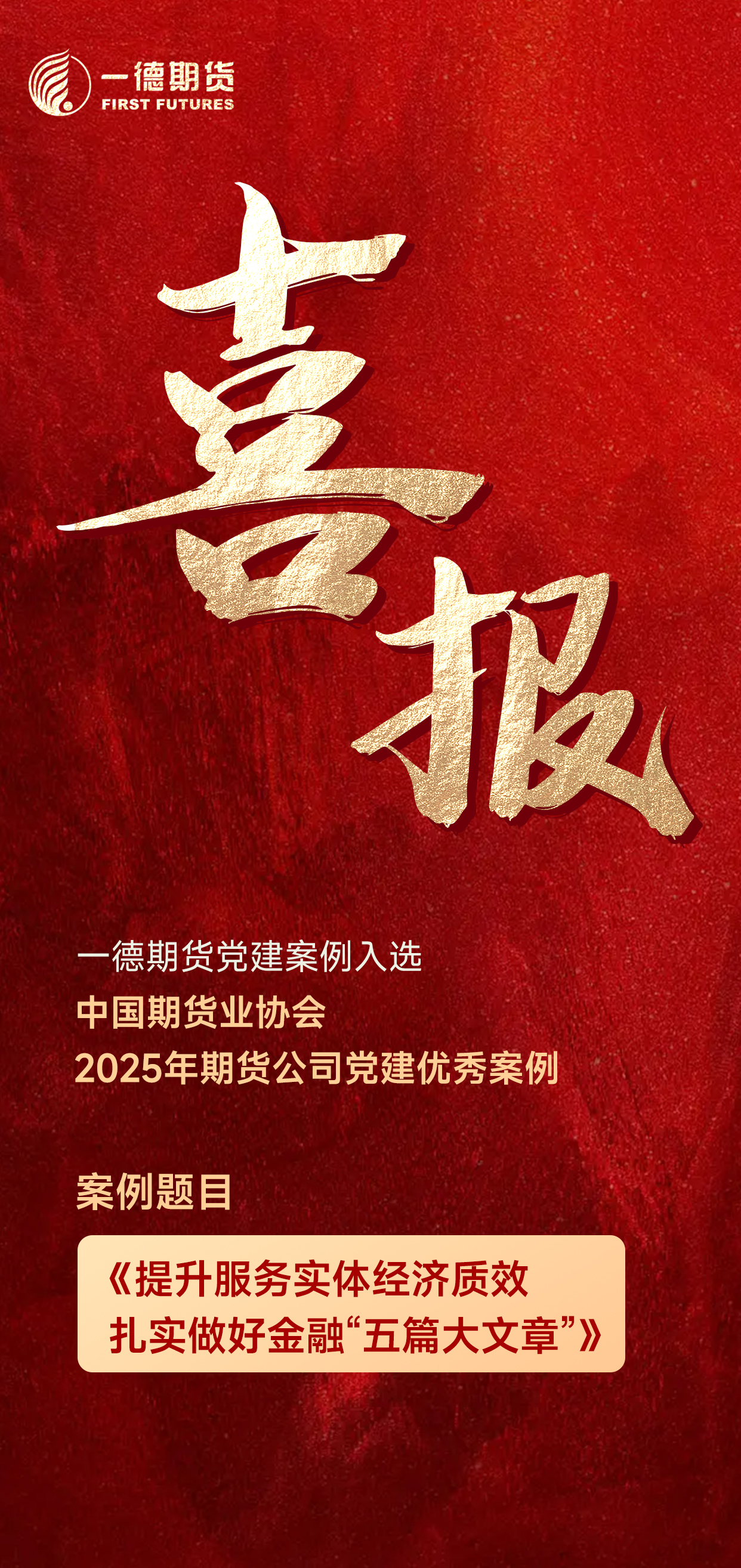 近日,中国期货业协会公布“2025年期货公司党建优秀案例”入围名单,一德期货有限公司报送的《提升服务实体经济质效 扎实做好金融“五篇大文章”》案例成功入选。这是一德期货自2023年以来连续第三年获评期货公司党建优秀案例。